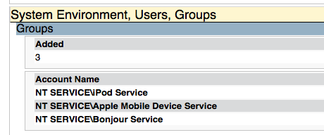 If the installer had created local accounts, they would also be identified in this report. Here, we see that the previously mentioned services are linked to the NT Service account.