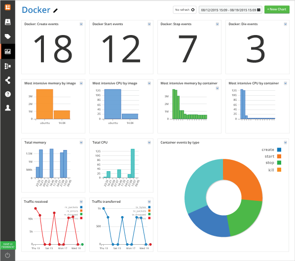 - Customized timeline graphs and bar charts that provide a detailed overview of network activity across all containers, visualizes average CPU and memory usage for all images and containers and displays a count of container events distributed by event type.