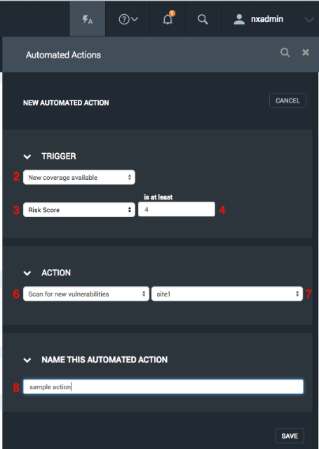 Let's configure an Automated Action that will initiate a scan when new coverage is available that meets to a certain criteria. In this example, we want to initiate a scan on a specific site when a new coverage which has a risk score of 4 or higher becomes available.
