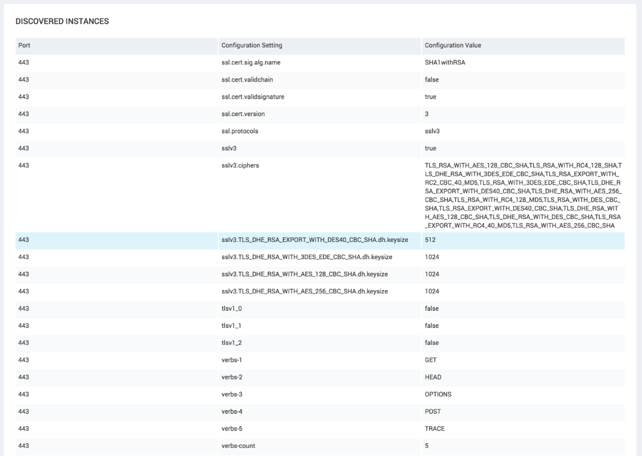 The new ssl.protocols configuration setting is a comma-delimited list of protocol versions supported by the endpoint. As a convenience, the sslv3, tlsv1_0, tlsv1_1, and tlsv1_2 settings contain "true" if that protocol is supported, or "false" if Nexpose was unable to connect via that version. In this case, we can see that only SSLv3 is supported. The sslv3.ciphers setting is a comma-delimited list of cipher suites available when using SSLv3 to connect to the service. There are also dh.keysize settings indicating the size of the key used by cipher suites that use Diffie-Hellman key exchange.