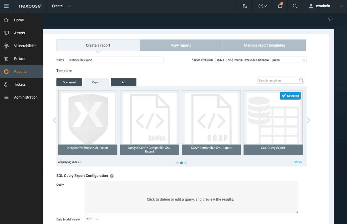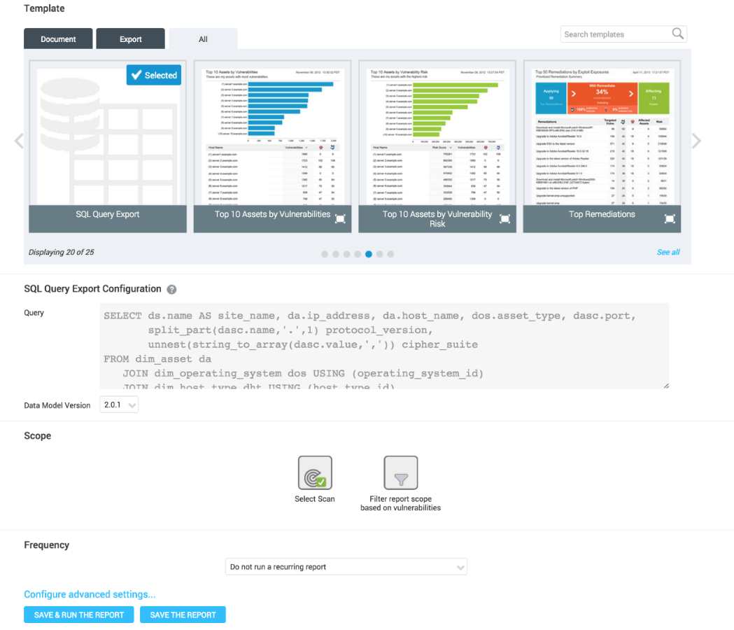 Although having all the cipher suites in the service configuration is convenient for taking a quick look at how a service is configured, it does not lend itself well to bulk or offline analysis. To facilitate this, the data can be exported as a SQL Query Export with a row per cipher suite. This is done by going to the Reports tab, choosing Create a Report, giving it a name (here "ciphersuite export"), choosing the Export tab and then the SQL Query Export template: