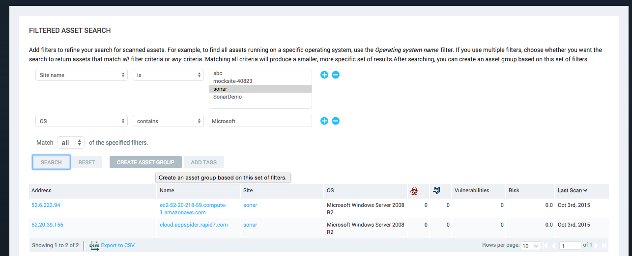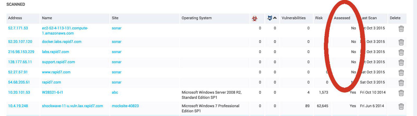 On the Nexpose assets page, imported Sonar assets will be found in the ‘scanned' asset listing. The ‘assessed' column will say ‘no'.