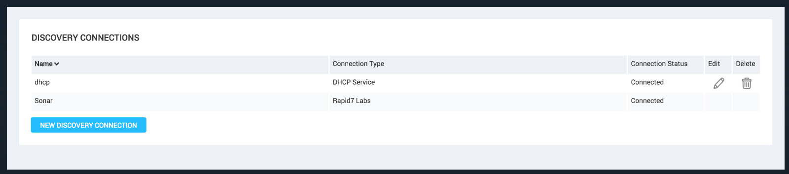 We wanted the user to be able to confirm this connection was active. Since Sonar represents a new way for the user to discover assets, showing the connection in the ‘Discovery Connections' listing was a natural fit.