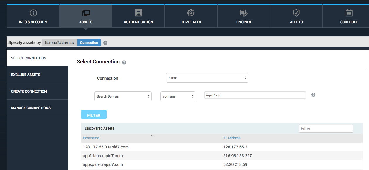 Sonar ‘scans the internet' so it contains a huge dataset with has varying degrees of freshness. We could not automatically collect data without user input. In the simplest case, a target ‘search domain' would be required. We already had a mechanism in place for specifying a set of filters to be applied to a connection from which assets could be pulled. When creating a site, the user is given several options to specify which assets to scan. One of those options is via discovery connection. And discovery connections allow the user to create filters.