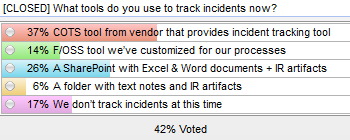 On our webcast, we did a (laughably un-)scientific survey of how folks were tracking incidents in their organization. There's going to be a sample bias, but the questions we asked here would be useful with your own management.... so discuss them with your team and boss!