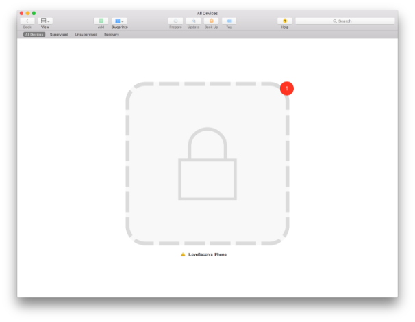 Connect your device to the computer running Apple Configurator 2 over USB. Ensure that you are under the All Devices tab. You will see your device appear. If a Lock icon appears, unlock the device.
