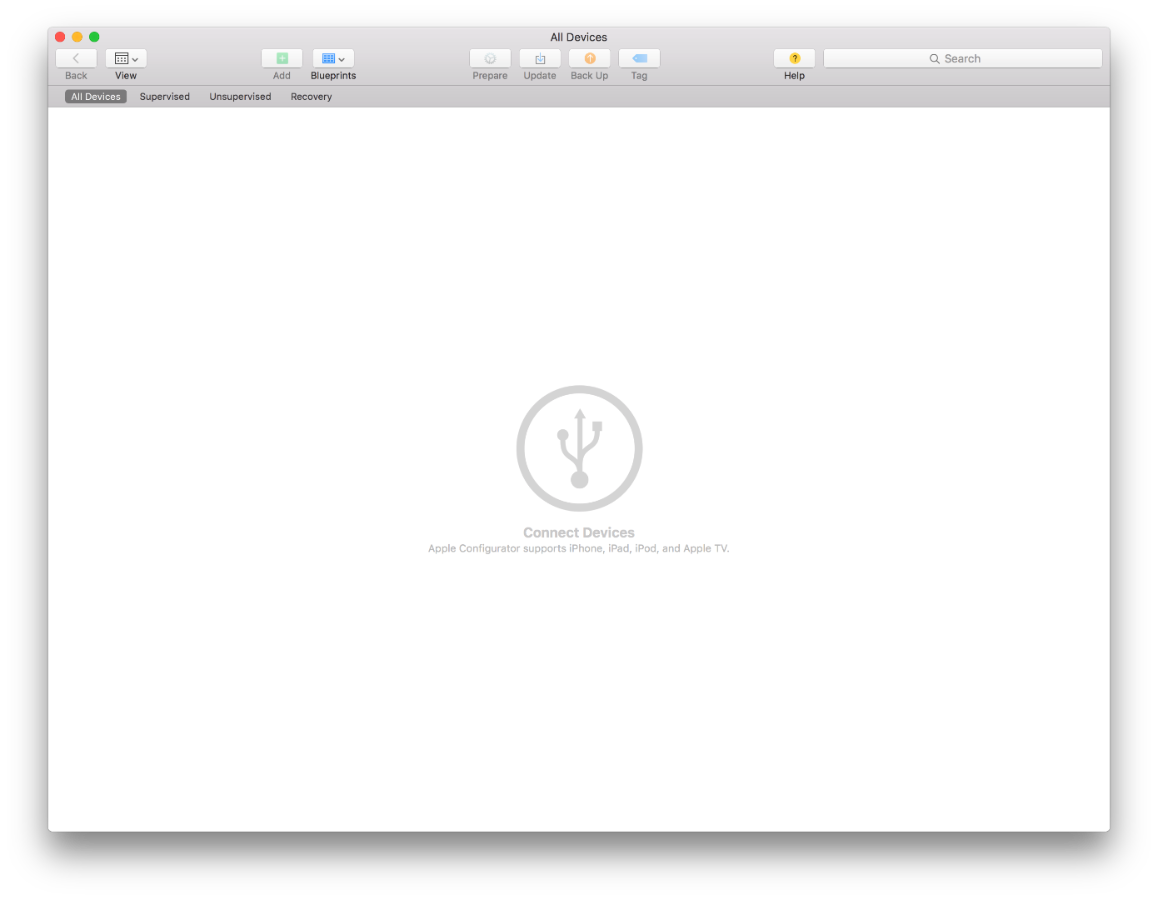 From the Mac App Store, install the Apple Configurator 2. Prior versions will not work with iOS 9. Make sure no devices are connected via USB and start the Configurator.