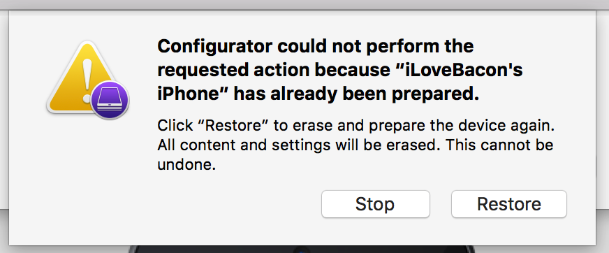 Select your device by clicking on it in the Apple Configurator, then click Prepare.