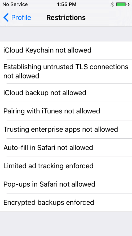 If you enable all of these features, you now have an iOS device that is less susceptible to man-in-the-middle attacks to steal data or credentials, that is more resistant to adversaries that might want to back it up to a computer to dig into the backed up data, is slightly better at handling websites securely, and that will enforce your backup strategy and be protected against malicious enterprise applications.