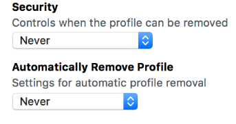 - The Security and Automatically Remove Profile field are interesting. If your device is supervised, it can't be paired to iTunes. You can chose to set the profile to be removable Always (dangerous, especially if you expected to prevent an adversary from being able to perform an iTunes backup!), With Authorization (a passcode that it will prompt you for, which I would recommend not storing on or with the device), or, the most secure option but most restrictive, Never. As for Automatically Remove Profile, for personal usage, I can't think of any reason not to set it to Never.