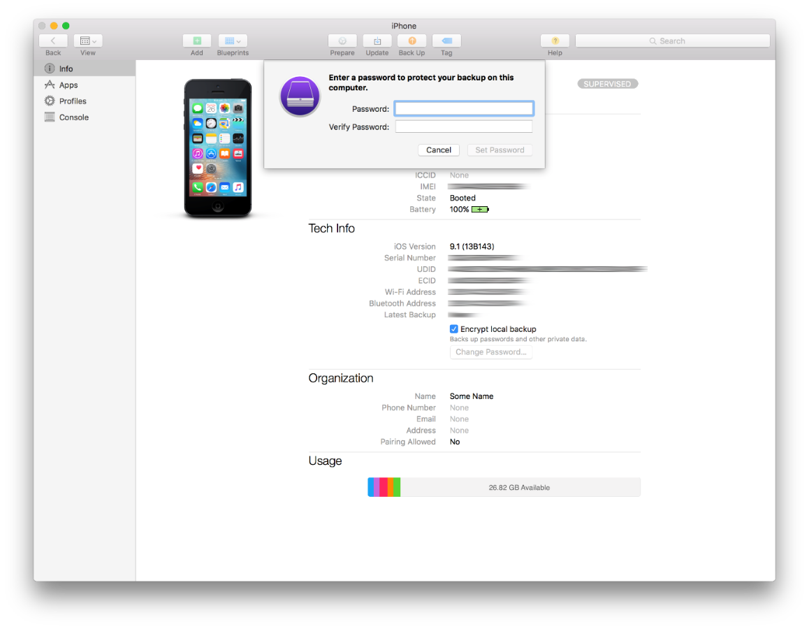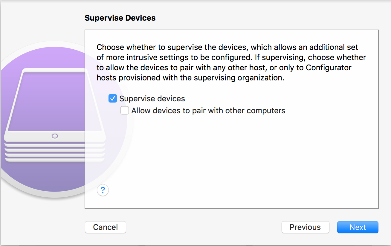 - Supervision Identity: If prompted, create a supervision identity. If you already had one, this means you already had supervised devices configured from this computer. If not prompted, you are either not supervising the device, or as you didn't have one before, an identity will be created automatically. The identity, in reality, consists of certificates used between the iOS device and Mac to authenticate the USB connection. Make sure those are backed up, since a lost supervision identity could mean having to wipe the device to modify the profile in the future.
