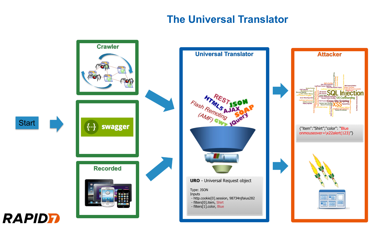 The diagram above shows how the Universal Translator works. It consumes data that comes in from three sources, a traditional crawl, recorded HTTP traffic and now, Swagger files. It then normalizes that data into a standard format and then completes the attack phase of the application security test.