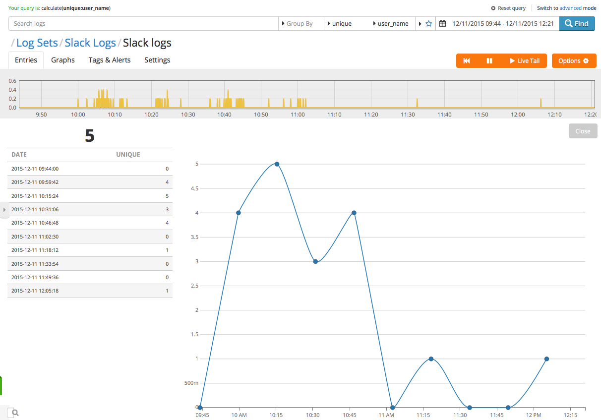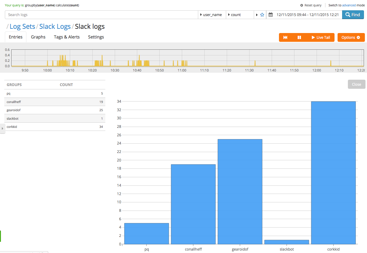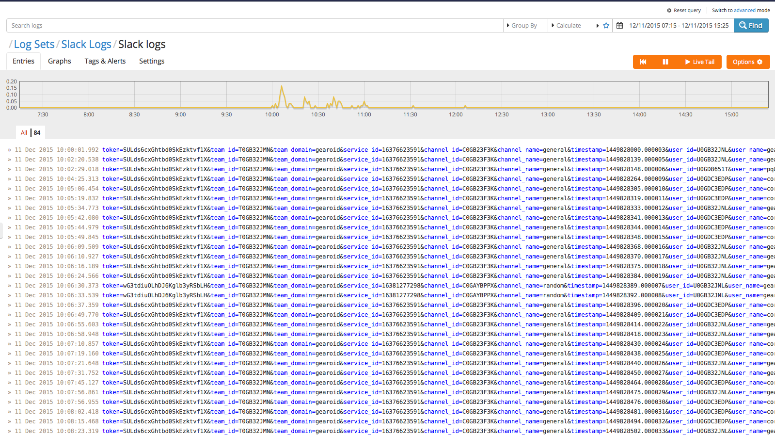 Then save and it’s done. You’ll start to see log data streaming in as people yammer away to each other, and it’ll start to look like this: