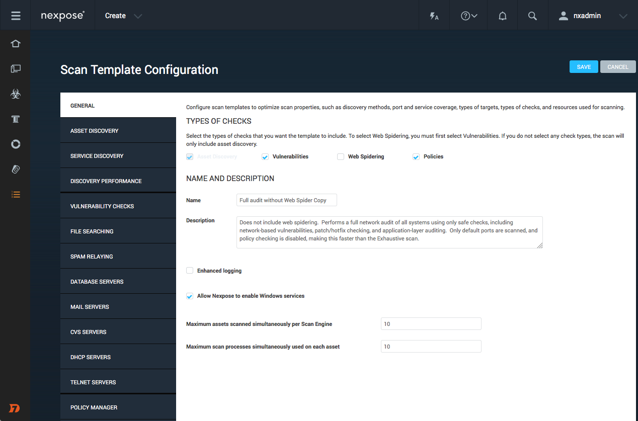 - In the new window showing "Scan Template Configuration" options, enable check box for "Allow Nexpose to enable Windows services"