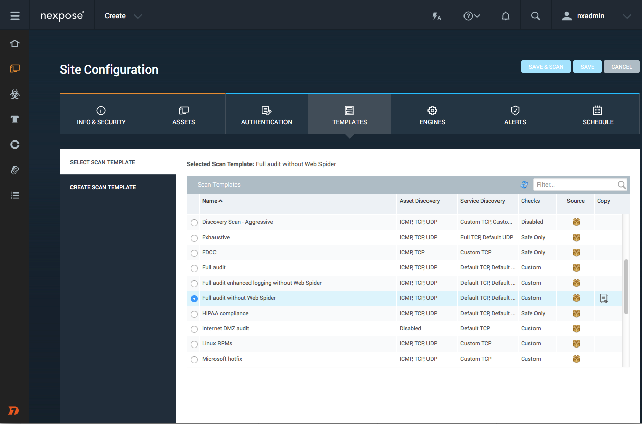 - Under the "Select Scan Template" section - copy an existing template using the icons at the end of the table row (or edit a custom template)