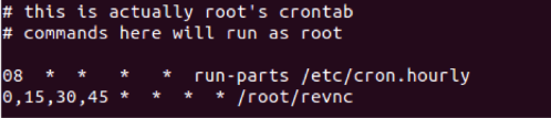 Finally we need to add this script to the devices crontab so it executes at given intervals to reestablish my reverse shell back into the network. In this case I am going to set it to connect back every 15 minutes. To edit the crontab us the following command: