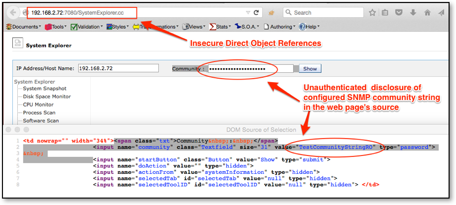 As a result of this direct access without authentication, an attacker is able to view the HTML of the web page SystemExplorer.cc. Here, it was discovered that the product's configured SNMP community string is transmitted in clear text as shown in Figure 6.