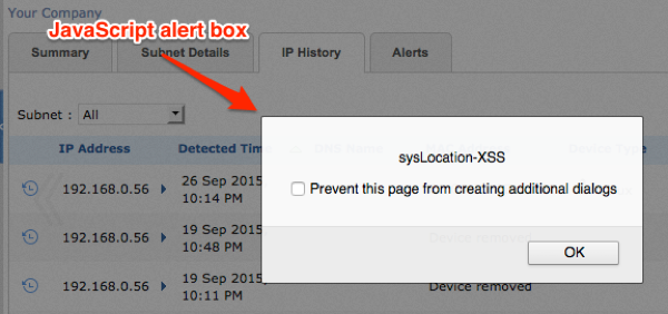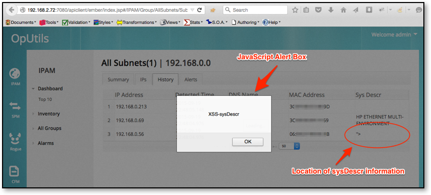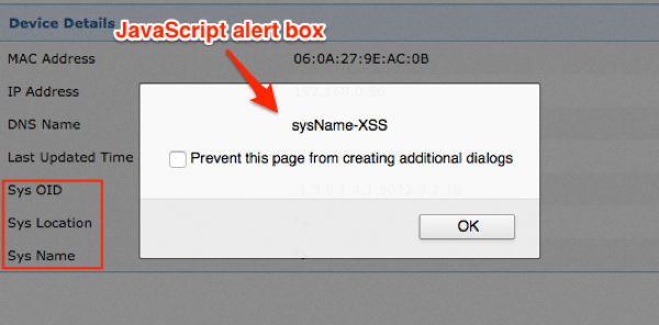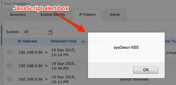The following example shows the results of discovering a network device where the SNMP sysDescr has been set to <SCRIPT>alert(“XSS-sysDescr”)<SCRIPT> . In this example, when device is viewed within OpUtils API UI web console, the JavaScript executes rendering an alert box within the authenticated users; web browser.