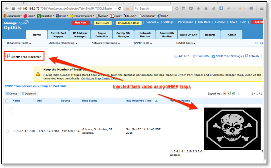 The second method of injection involved SNMP trap messages. By spoofing an SNMP trap message and altering the data within that trap message, a malicious actor can inject HTML and JavaScript code into the product. When the trap information is viewed within the SNMP Trap Receiver the code will execute within the context of the authenticated user. Figure 5 shows an example attack where a trap message was used with the following HTML code <embed src=//ld1.us/4.swf> to embed flash into the Trap Receiver section of the UI.