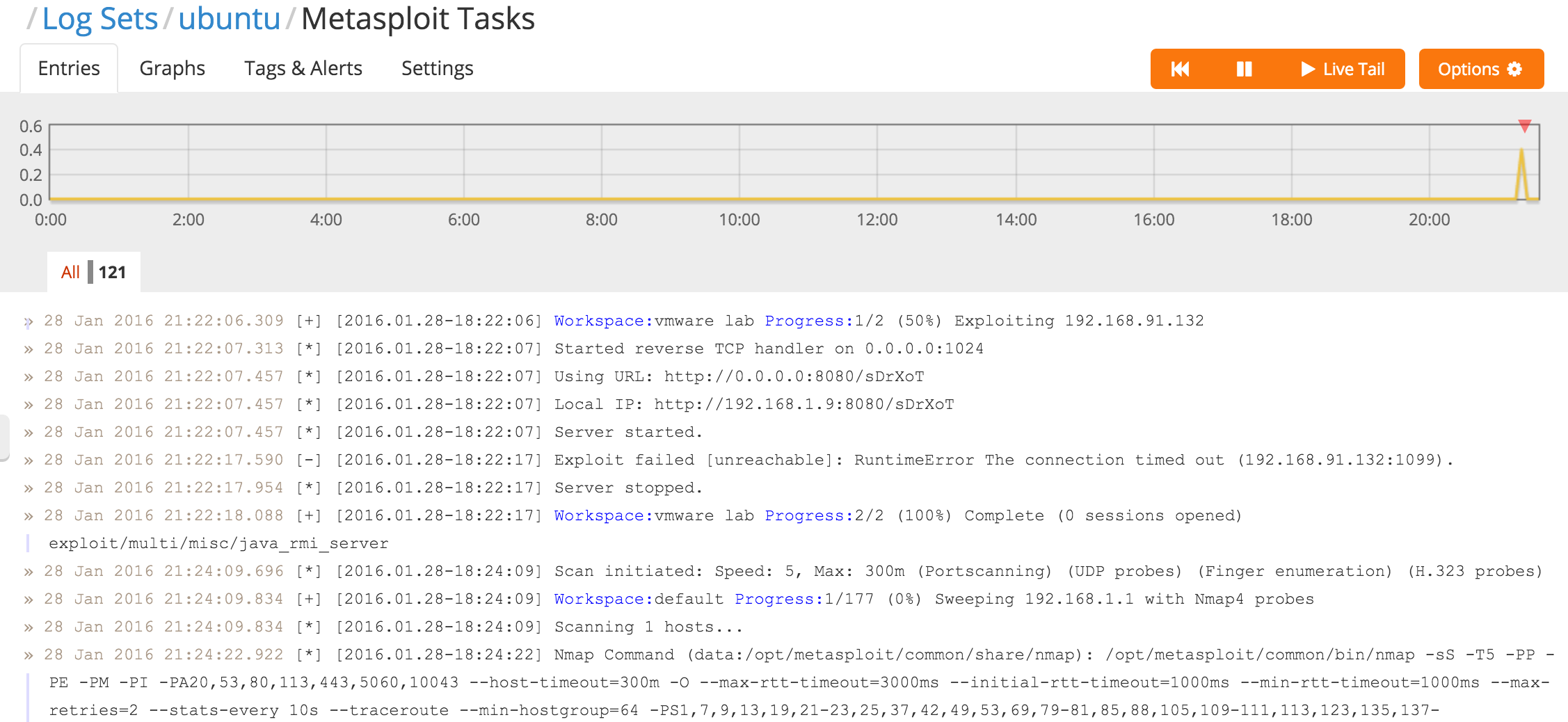 Metasploit's NGINX server is configured to log in combined log format, and as a result Logentries will be able to perform in-depth analysis on these logs with ease. The video below provides a tutorial on using the advanced search functionalities of Logentries to query an Apache access.log, all the same features and functionality will be available with this NGINX access.log.