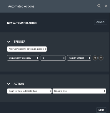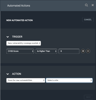 As you can see the example on the right, this trigger will initiate a scan action if there is a new coverage available that meets the criteria of CVSS score is 8 or above. This Automated Action is ideal for assessing for high-risk vulnerabilities right away. With Rapid7 Critical vulnerability category, we are giving you another indicator for high-risk vulnerabilities.