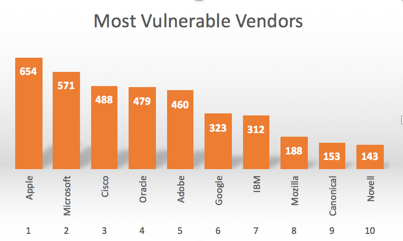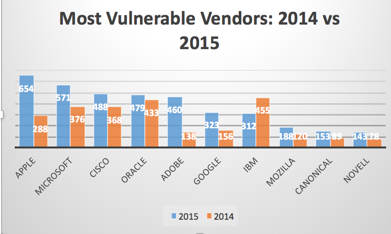 Apple had the most number of vulnerabilities in 2015. Of course with many iOS and OSX vulnerabilities out there in general, it's no surprise this number went up.
