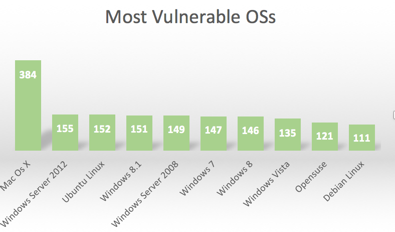In 2015, according to the NVD, OSX had the most vulnerabilities, followed by Windows 2012 and Ubuntu Linux.