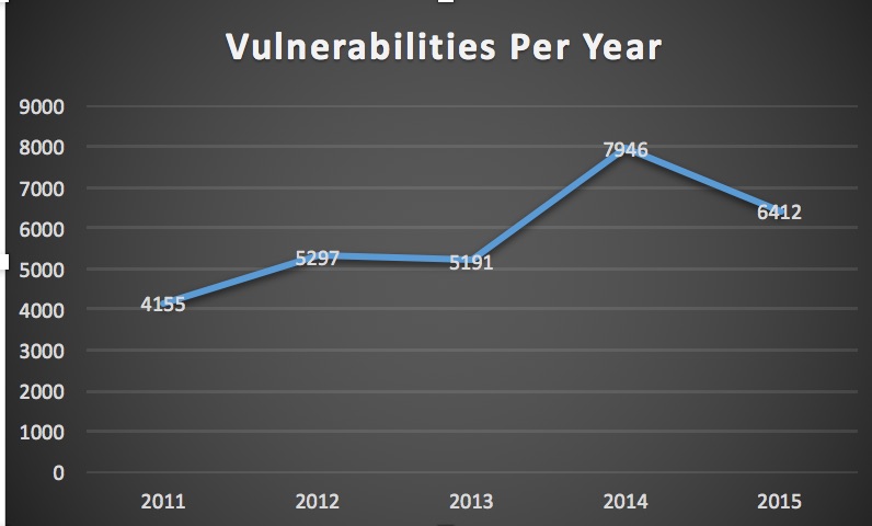 That is correct! Believe it or not, there was a 20% drop in the number of vulnerabilities compared to the number of vulnerabilities in 2014. However, if you look at the overall trending growth in the last 5 years, the 2015 number seems to be consistent with the overall growth rate. The abnormality here was the 53% increase in 2014. If we compare 2015's numbers with 2013, then we see 24% increase.