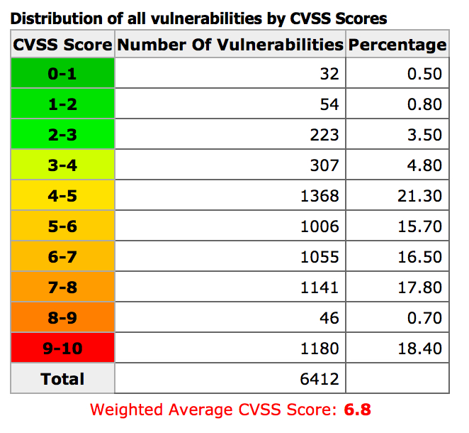 This means 36% of the vulnerabilities were critical (CVSS >=7). The average CVSS is 6.8 so that is at the boundary to be critical.