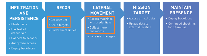 Once an attacker has an initial foothold on your network (above, Infiltration and Persistence), their work is not complete. Their next steps are reconnaissance: learning more about the environment and where they need to pivot to next. This behavior, such as network scans, password guessing attempts, and pass-the-hash is very different than the actions your users take every day and leaves tangible, identifiable traces.