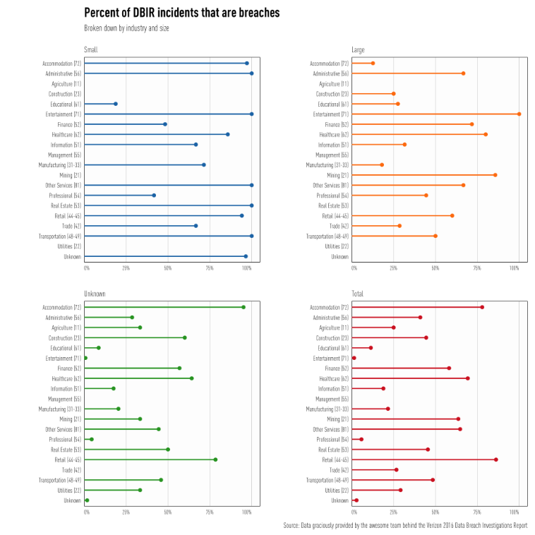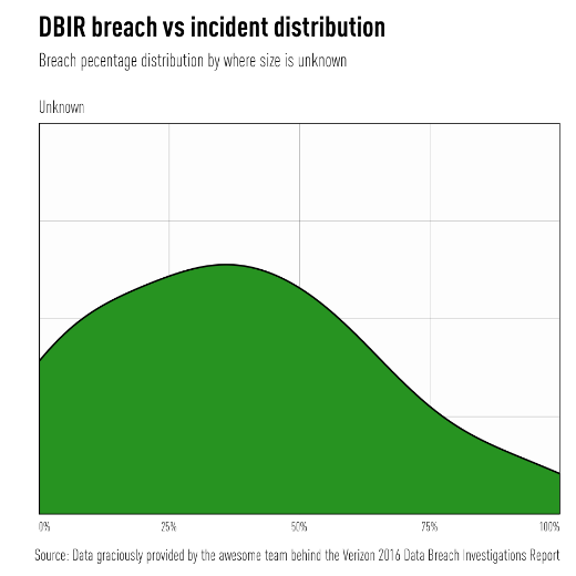 There are a couple "gotchas" with data submitted to the DBIR team. The first is that a big chunk of data comes from the U.S. public sector where there are mandatory reporting laws, regulations, and requirements. The second is the YUGE number of Unknowns. The DBIR acknowledges this, and it's still valuable to look at the data when there are "knowns" even with this grey (okay, ours is green below) blob of uncertainty in the mix. You can easily find your industry in DBIR Tables 1 & 2 (pages 3 & 4) and if we pivot on that data we can see the distribution of the percentage of incidents that are breaches: