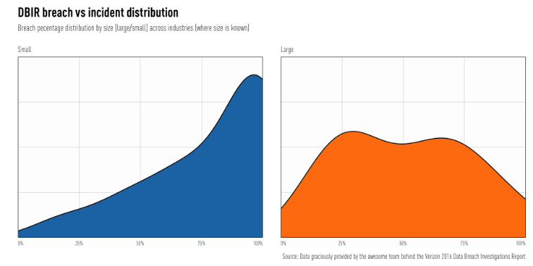 We've removed the "Public (92)" industry from this set to get a better sense of what's happening across general industries. For the DBIR, there were more submissions of incidents with confirmed data disclosure for smaller organizations than large (i.e. be careful out there SMBs), but there's also a big pile of Unknowns: