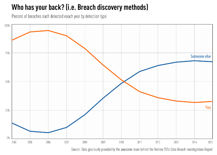 When reading any report, one should always check to make sure the data presented doesn't conflict with itself. One way to add a validation to the above detection deficit is to look at DBIR Figure 9 (page 11) which shows (when known) how breaches were discovered over time. We can simplify this view as well: