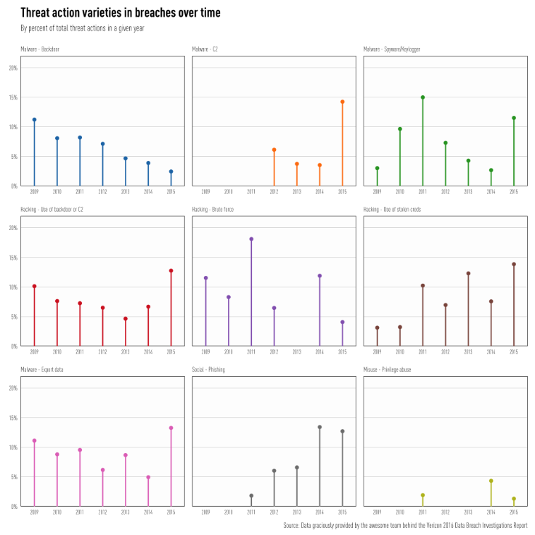 - Key loggers are making a comeback (this may be an artifact of the heavy influence of Dridex in the DBIR data set this year)