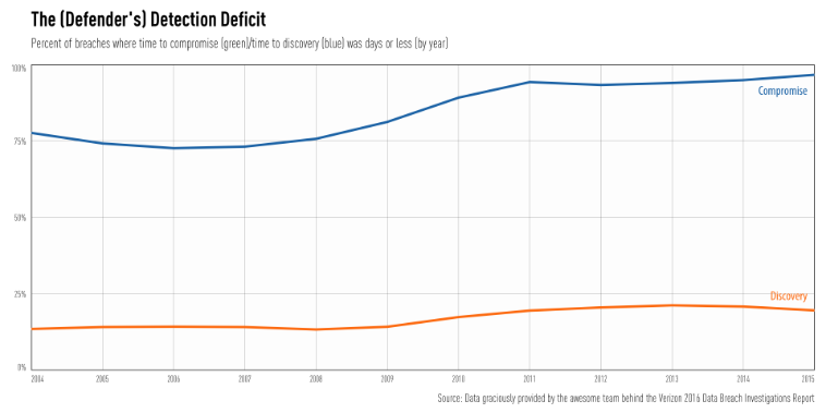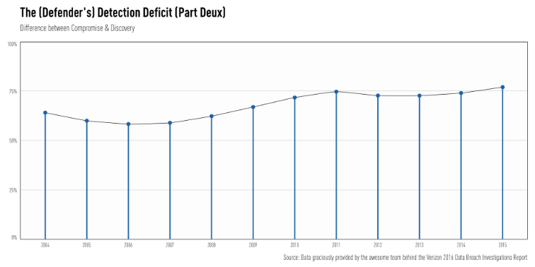Remember, the DBIR data is a biased sample from the overall population of cyber security incidents and breaches that occur and every statistical transformation introduces more uncertainty along the way. That means your takeaway from "Part Deux" should be "we're not getting any better" vs "THE DETECTION DEFICIT TOPPED 75% FOR THE FIRST TIME IN HISTORY!"