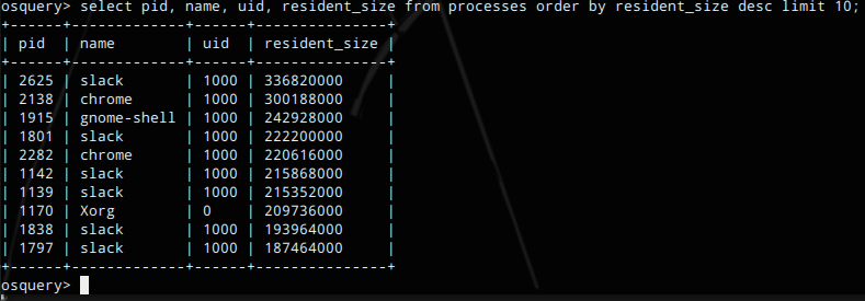 select pid, name, uid, resident_size from processes order by resident_size desc limit 10;