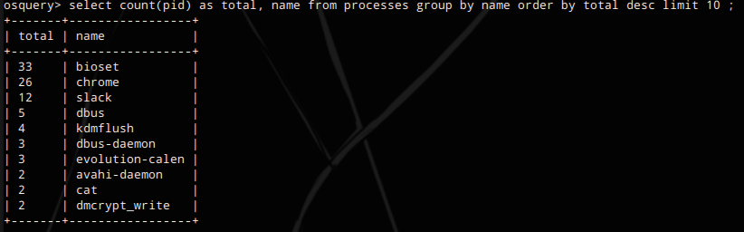 select count(pid) as total, name from processes group by name order by total desc limit 10;