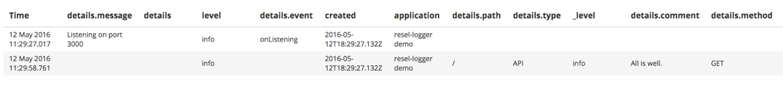 12 May 2016 11:29:58.761 { "application": "resel-logger demo", "created": "2016-05-12T18:29:27.132Z", "details": { "path": "/", "method": "GET", "type": "API", "comment": "All is well." }, "level": "info", "_level": "info" }