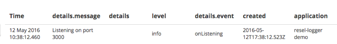 May 2016 10:38:12.460 { "application": "resel-logger demo", "created": "2016-05-12T17:38:12.523Z", "details": { "event": "onListening", "message": "Listening on port 3000" }, "level": "info" }