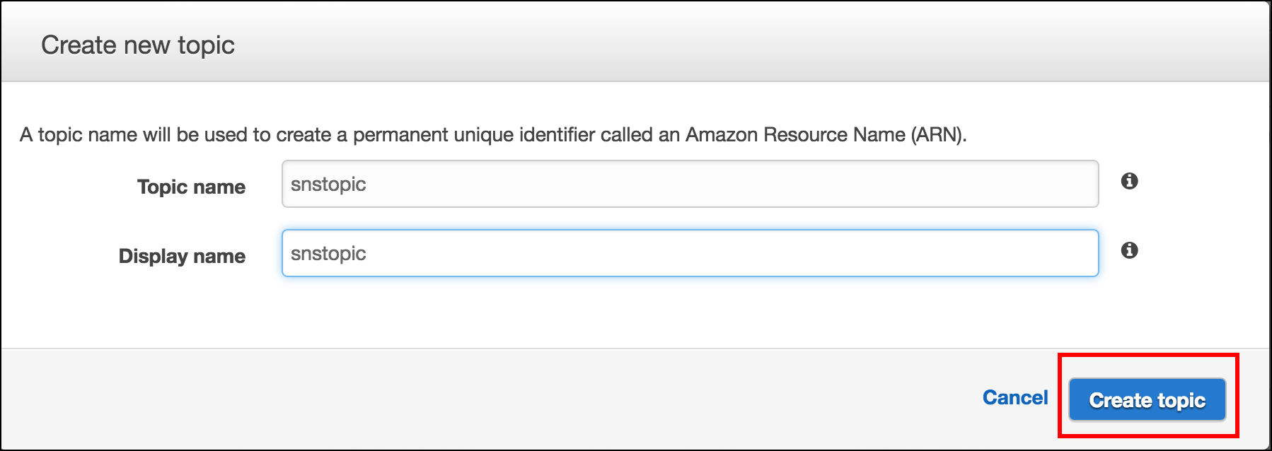 Upon arriving at the Create new topic page, add a Topic name and Display name in the respective text boxes. In this case, I’ve used the term, snstopic for both Topic and Display Name. (See Figure 9, below.) Then, click the button, Create topic on the lower right of the dialog.