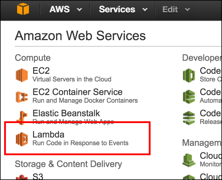 To create the Lambda function we’ll go to the Lambda service in AWS. To get to the Lambda services home page, click the Lambda services image on the Amazon Web Services home page as shown below in Figure 11.