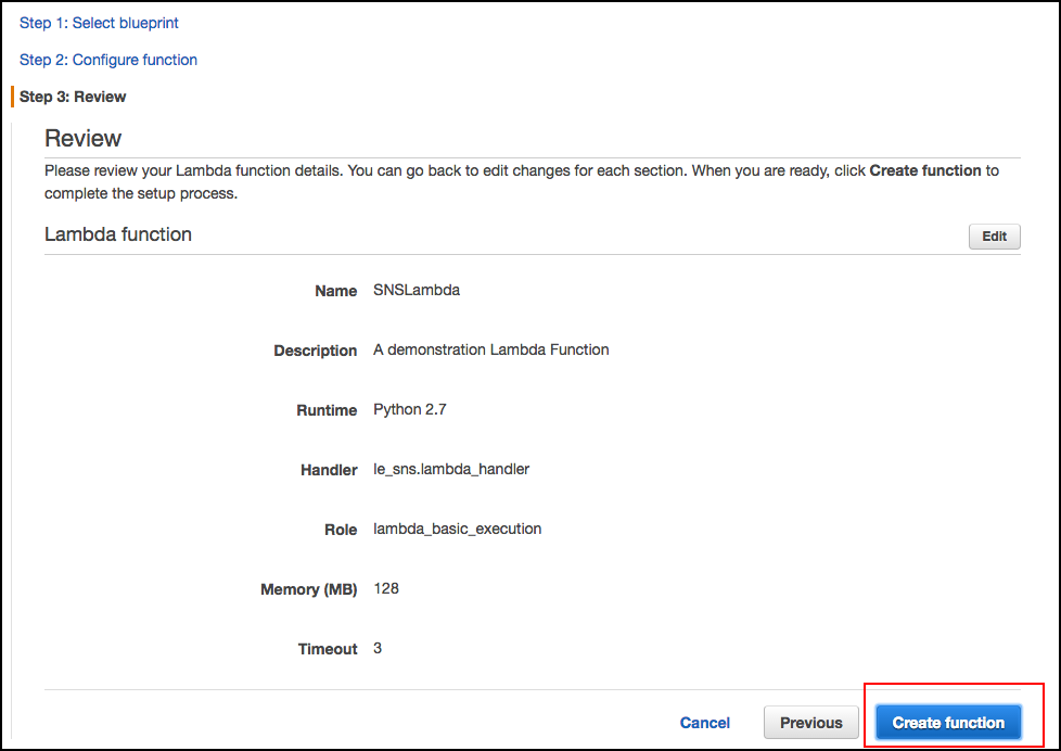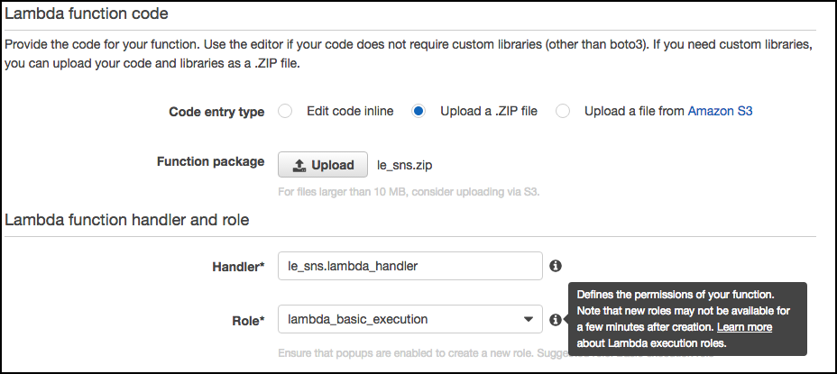 Still, demonstrating now to get a Lambda function to interact with SNS explains the concepts you need to know well. Using the Logentries code kills two birds with one stone. First, should you so desire, you can explore the code provided by Logentries to learn the details of programming Lambda functions in Python. Second, using the Logentries’s code allows you to gain experience using Lambda functions in a very clever manner.