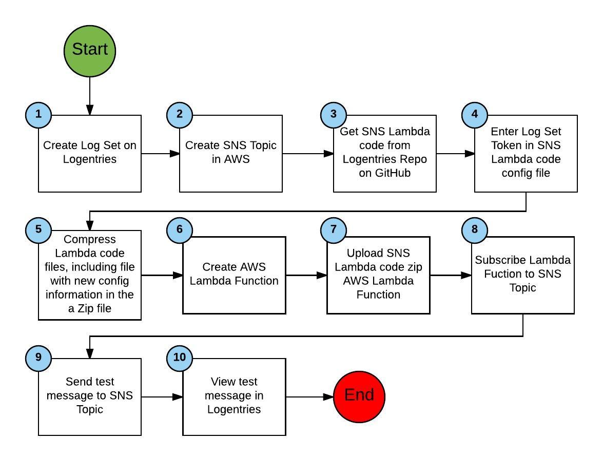 In this article, I am going to show you how to install the Logentries SNS Lambda code in your own Lambda function and then create a SNS Topic to which the Lambda function will subscribe. The result will be that any message to the SNS Topic you created will be forwarded onto the Logentries log set associated with the token that you set in configuration file. Figure 2 below shows the steps in the process.