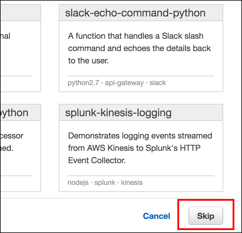 When you click the button labeled, Create a Lambda function, you will be taken to a page that displays a number of predefined Lambda functions. We’re not interested in any of these. So, click the button labeled, Skip on the lower right of the page, as shown below in Figure 13.