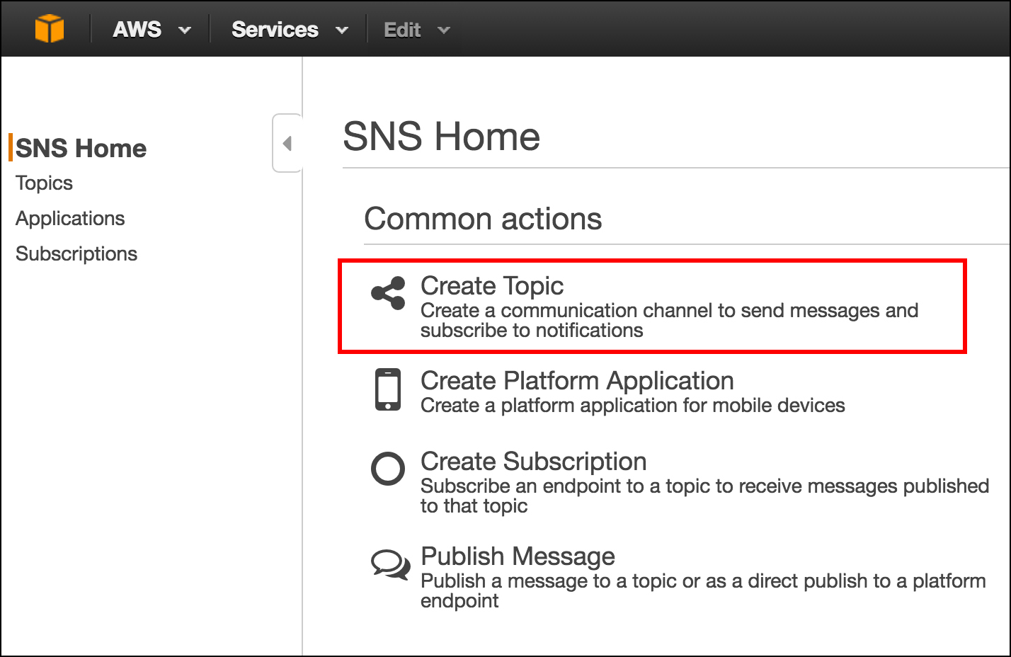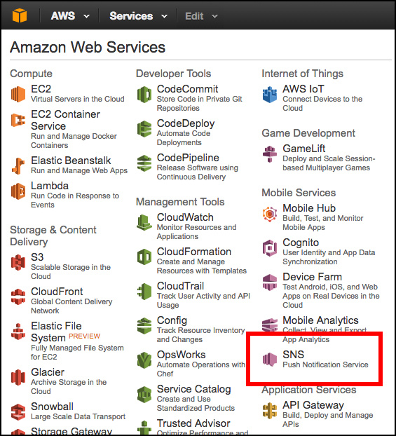 You create an SNS topic by first accessing the SNS service as shown in Figure 7 below. Click the SNS icon on the lower right to be taken to the SNS home page.