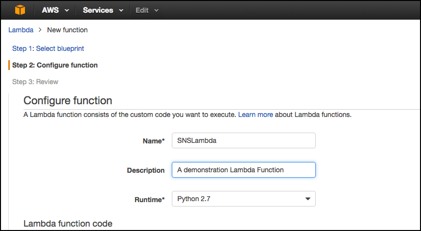In the Configure function page, enter a Name for your Lambda function and a Description in the text boxes as shown above in Figure 14. Also, for Runtime, select Python 2.7 from the drop down list. Then scroll down a bit to the section,* Lambda function code* as shown below in Figure 15.