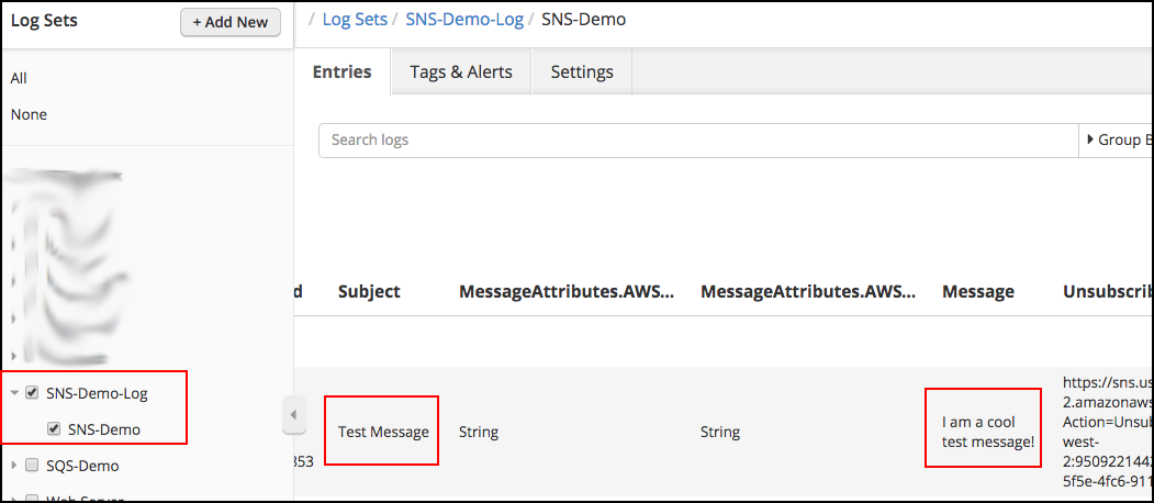 After you publish a message to the topic using the *Publish message *feature in the AWS Topic details page, wait a minute or two to given the message time to work its way through Logentries and into your log. Then, log in to the Logentries site and go to the Log Sets page.