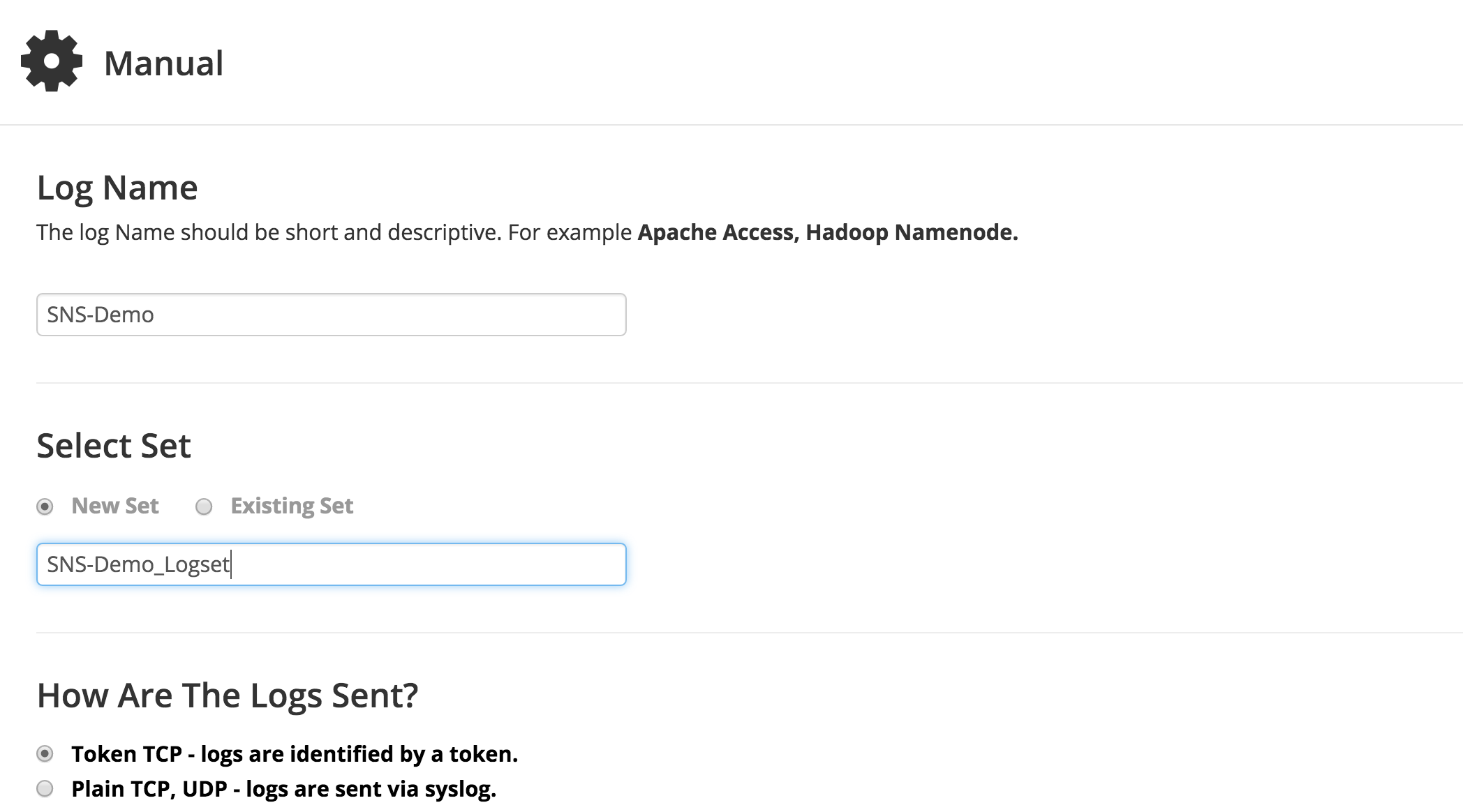 Clicking the button labeled Manual displays the Manual dialog. Enter a value for the Log Name and a value for a New Set in the Select Set text box, as shown below in Figure 5.