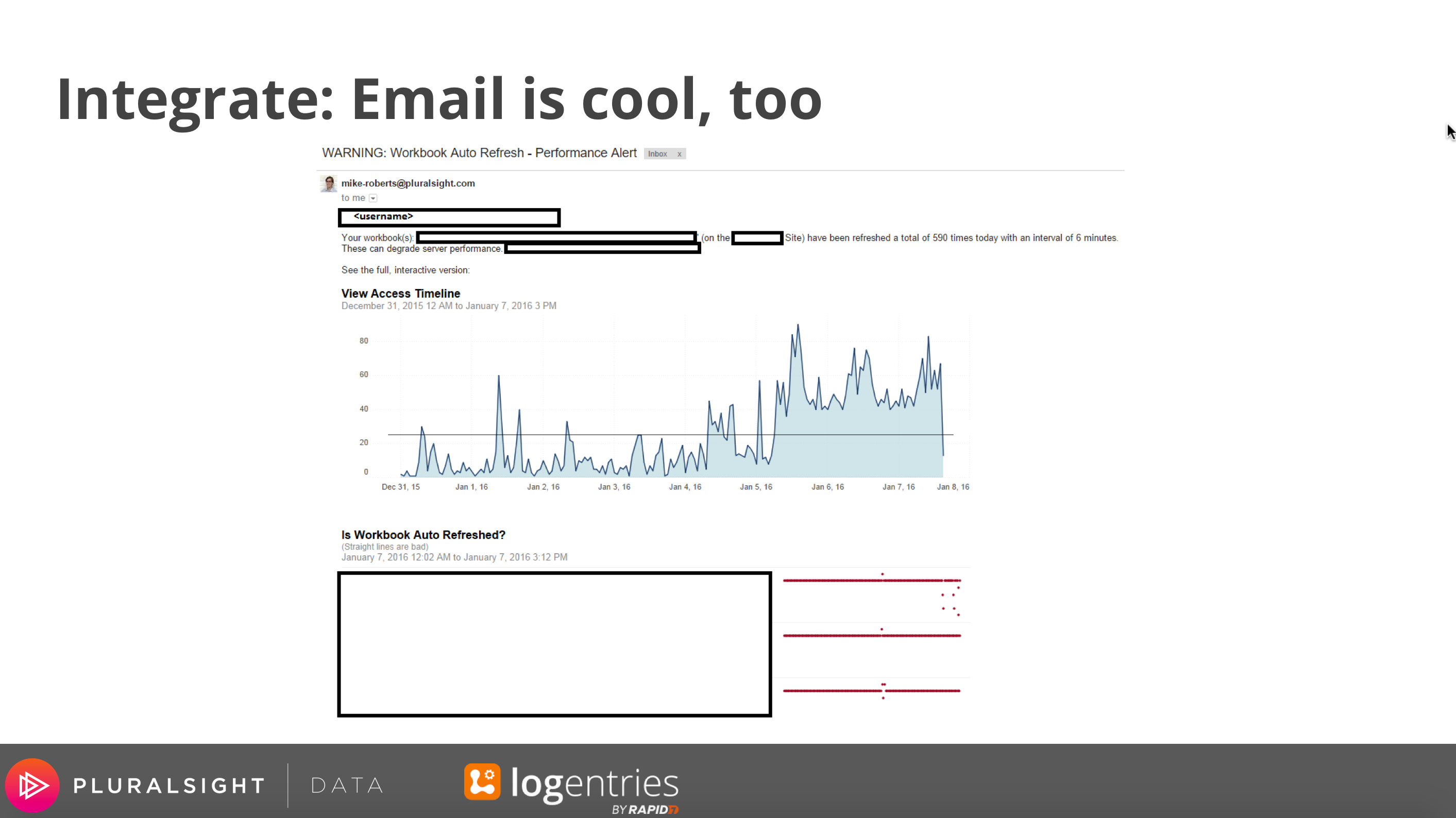 Mike has also built an impressive integration with email. The example below is an email delivered to a user that is refreshing their workbook at an abnormally frequent rate.