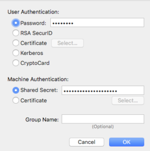 For Password, add the user’s server account password and then add the pre-shared key value for Shared Secret.